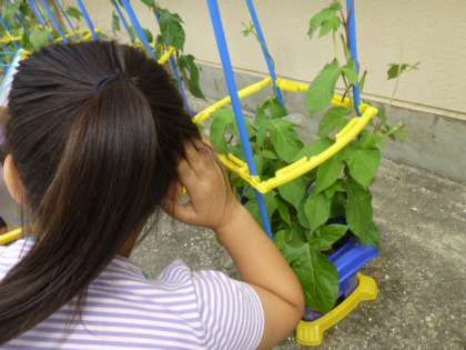 葉の枚数が増えたり,つるが伸びてきたりして,子どもたちは,とても嬉しそうにしていました。あさがおの成長を楽しみにして,あさがおに耳を傾けてお話をしている子もいました。あさがおとどんなお話をしていたのでしょうね。
