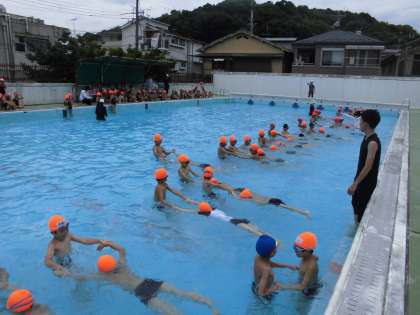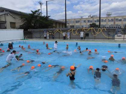 バディを組んで伏し浮きをしたり,引き舟をしたり,泳いだりして,楽しい水泳学習ができました。