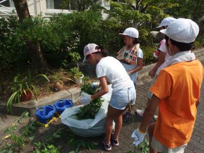 今日は「クリーン大作戦」がありました。全校児童で校庭・中庭の石を拾ったり,草を抜いたりしました。暑い中でしたが,頑張って取り組みました。夏休みの間にたくさんの雑草が生えていたところも,とてもすっきりしました。