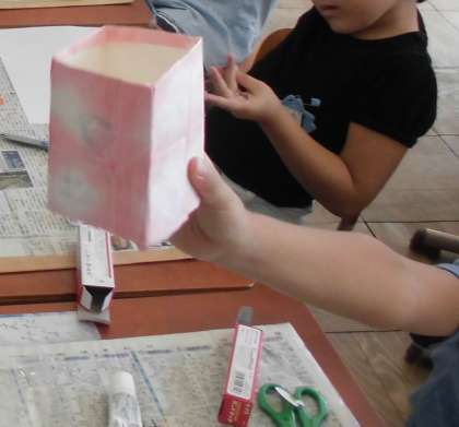 先日作った朝顔の色水で作った染め紙を使って,鉛筆立てを作りました。