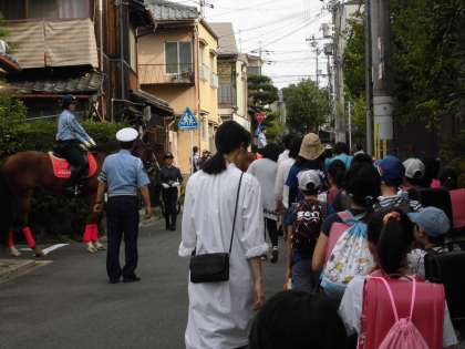 朝の登校時に,建勲神社の鳥居前と雲林院前の2か所に子どもたちが集まりました。子どもたちは,馬の迫力に「おぉ〜」「大きい!」等の声を上げながら,平安騎馬隊の馬を先頭に紫野小学校まで登校しました。