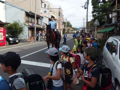 今年も,北警察署と交通対策協議会とPTAのみなさまのご協力により,「平安騎馬隊による交通安全指導」が実施されました。