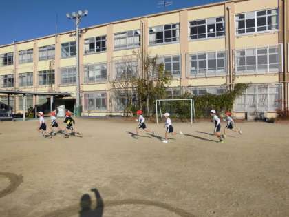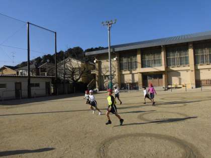 朝はとても寒かったですが,暖かい日差しを浴びて2年生が元気に体育をしました。