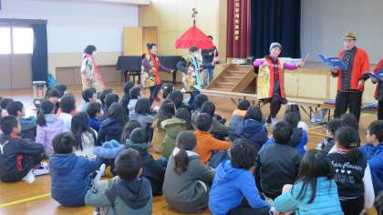 2月28日に控えた「子ども玄武やすらい祭」に向けて,どんな祭にしたいのか4年生全員で考えてきたことをパープルフレンズの方々に伝え,玄武神社にゆかりのある歌を歌ったり,金蘭を着させていただき,一緒に踊ったりする体験をしました。