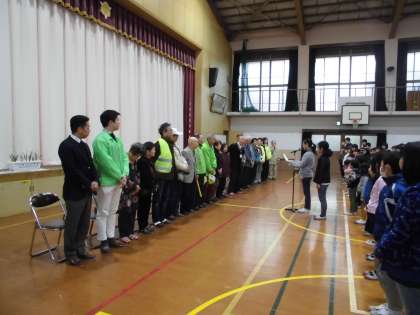 毎日の登下校でお世話になっている見守り隊の方に来ていただいて,感謝の気持ちを伝えました。