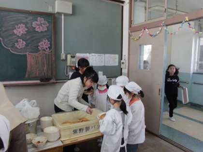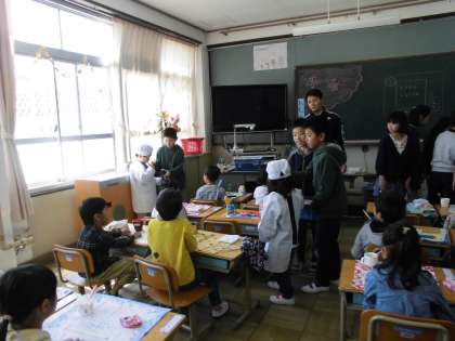 6年生が登校の支援をしてくれたように,給食は5年生がお手伝いに来てくれました。