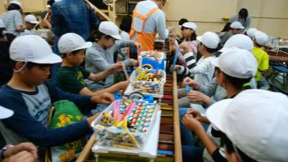 作った吹き戻しに息を吹き込むと,くるくると丸めた先端部分が見事に伸びて,子どもたちは大喜びでした。