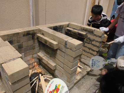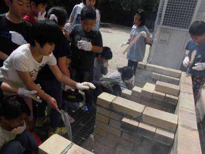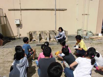 学校にあるかまどで,新聞紙に火をつけまきに燃え移るようにグループで協力して“火起こし体験”をしました。
