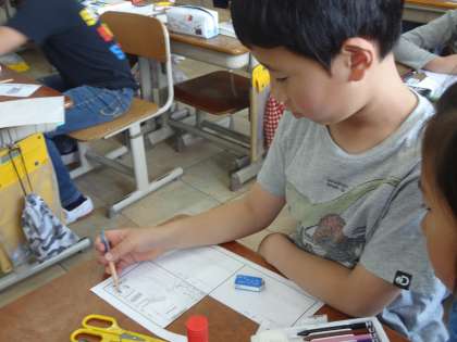 社会科では,「学校の周りの様子」についての学習をしています。校区探検をした後に,学校のよく行く場所を絵地図に表しました。それを見て,気付いたことを話し合うと「絵地図はとても詳しいけれどゴチャゴチャしているなあ。」との声。そこで,本物の地図には,何があるのかを調べました。子どもたちは,「東西南北があるよ。」「絵じゃなくて,マークの方が分かりやすいよ。」と方角や地図の記号があることに気が付きました。地図記号を調べてみると,それぞれの意味に合った形になることが分かりました。子ども達は,地図記号に興味深々です。調べた記号を使って地図に加えると,「何があるのか分かりやすい!すっきりしたね。」と地図に表すことの良さを実感していました。