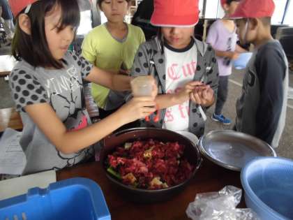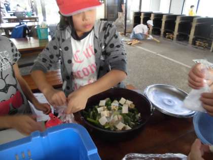 かまど係,食器係,材料係の連携もよく,学校で練習した甲斐もあってスムーズに進んでいます。