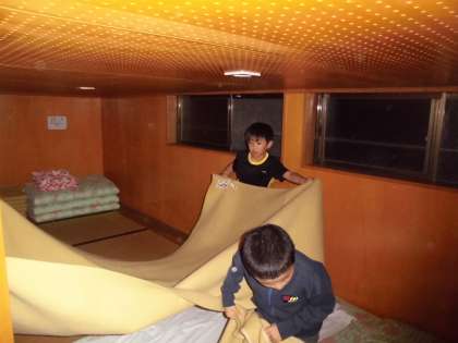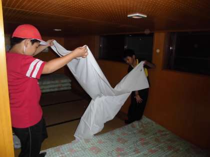 教えていただいた通りに,友達と協力して“ベッドメイキング”です。