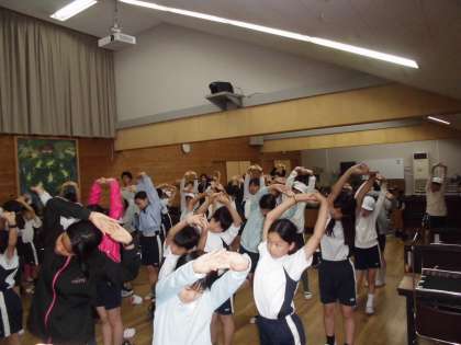 「朝の体操」をしたり,今日のテーマである「友情」の確認をしたりしました。