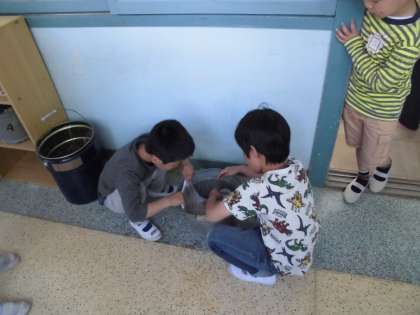 これまで,掃除の時間にグラウンドの石拾いをしていた1年生が,連休明けからは教室の掃除を始めました。6年生のお兄さん,お姉さんに教えてもらいながら雑巾を使って掃除しています。教室がピカピカになるように頑張っています。