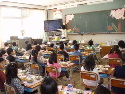 今日4月12日から,今年度の学校給食が始まりました。初日は入学祝い献立で,「小型コッペパン・牛乳・スパゲティのミートソース煮・ほうれん草のソティ・りんごぜりーー」という内容でした。1年生の子どもたちは,給食室からのいいにおいに,「いいにおいやなぁ。」「スパゲティやって,はよ食べたいな。」と,初めて食べるきゅう食をとても楽しみにしてくれていたようです。エプロン・帽子を身に着けて自分たちできゅう食の用意をしました。いよいよ「いただきます!」。モグモグ,しばし静かに食べていた1年生です。しばらくすると,「スパゲティおいしい!」「やさいもおいしい!」「せんせい,パンのおかわり あるの?」「スパゲティ おかわりして いい?」と,みんな,しっかり味わって おいしく食べてくれました。もちろん,残菜は0でした。