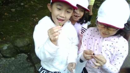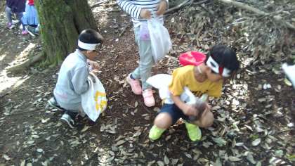実際に出掛けると,子どもたちは「赤色の葉っぱが落ちていたよ!」「持ってきたペットボトルにどんぐりを入れるとカタカタと音がするよ!」「どんぐりが帽子を被っている!」と各々,「あき」を見つけることができました。