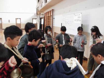 今日は,地域の方にそれぞれの楽器の演奏の仕方を教えてもらい,一人一人の役割を決めました。