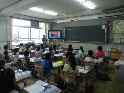 2年1組は,図画工作で,絵の具の色を混ぜ合わせてどんな色ができるかを学習しました。動画を見ながら,混色のポイントについて学びました。