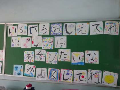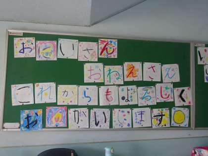 そのために,ビデオ撮りをしたり,ひらがなの学習を生かして,一人一文字をカードに書いて,写真を撮りました。