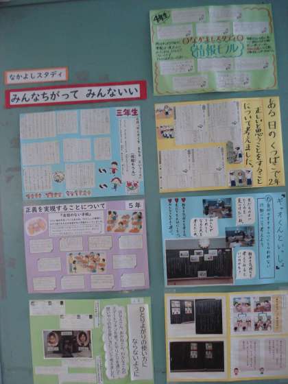 「なかよしスタディ」での学習の様子をまとめたポスターを南校舎の廊下に掲示しました。テーマは,「みんなちがってみんないい」です。学年ごとに題材を決めて思いや考えをたくさん出し合いました。学習の足跡がよくわかります。