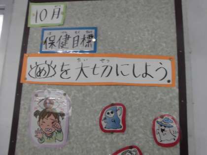 10月の保健目標は,「目を大切にしよう」です。10月10日は目の愛護デー。この日に合わせて,廊下には,目の錯覚についての特集やクイズが掲示されています。目を大切にするためにはどうすればよいのか,みんなで考えていきたいです。