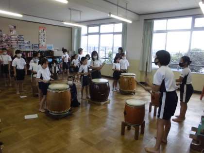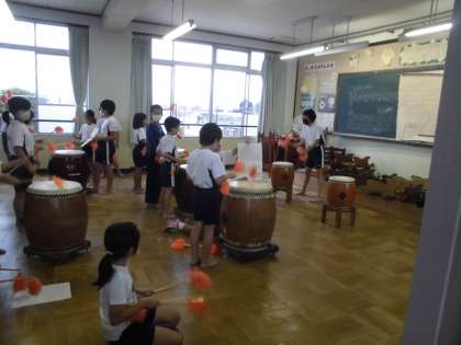 和太鼓部では,はじめに基礎練習をしました。ならし打ち⇒地打ち⇒強弱打ちの順に取り組みました。続いて,「かがり火」の練習をしました。5年生が活動をリードしました。最初はゆっくり,慣れてきたら少しテンポを上げて打ちました。バチの扱いにも,慣れてきました。くるくるとバチを回転させながら打つところが,とても楽しいです。