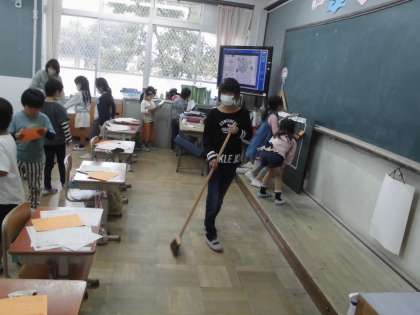毎日,午後1時30分〜40分の10分間,清掃活動を行っています。スーパーリーダーである6年生は,この活動でも大活躍です。1年生の教室に足を運び手伝ったり,最も砂ぼこりの溜まる上履きロッカー前を掃いたりしています。6年生の姿は,他の学年のお手本にもなっています。