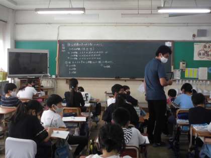 5年2組は,算数科で,公倍数の見つけ方を勉強しました。初めに,3と5の倍数を並べ,公倍数になる数を見つけて○で囲みました。次に,4,6,9の3つについても調べました。見つける方法がわかりました。