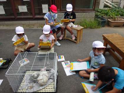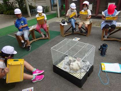 生活科の学習で,学校で飼っているうさぎの「ゆき」と「くろまる」の観察をしました。