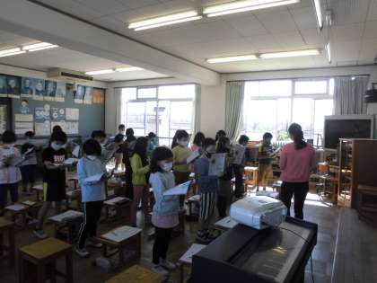 3年2組は,音楽科で,「旋律の特徴を生かして演奏しましょう」という単元を学習しました。「あの雲のように」という曲について,情景を想像しながら聴いたり歌ったりしました。おでこを意識して発声する頭声的発声の仕方も教わりました。