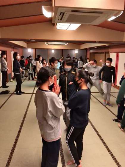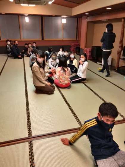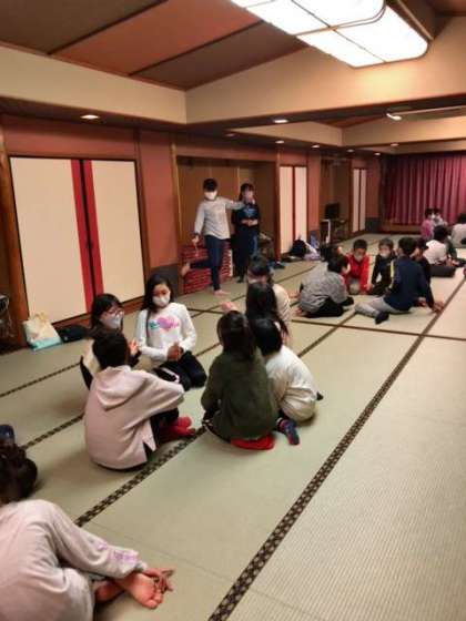 キャンプファイヤーでよく行う「猛獣狩りに行こうよ!」に模して、文字の数だけ人が集まるというゲームをました。「明治村」や「清洲城」が発声されると、みんな一生懸命に集まりました。