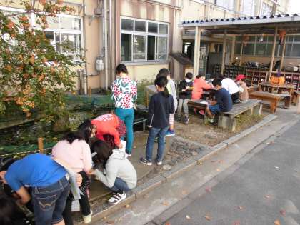 4年2組は,理科の学習で「季節と生物(秋)」の学習で,中庭に出て,夏の終わりとの変化を調べていました。