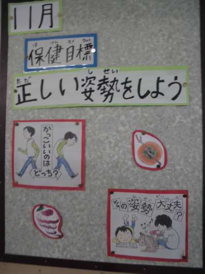 11月の保健目標は,「正しい姿勢をしよう」です。姿勢を正しく保つことは,身体の発達にとって,とても大切なことです。また,集中力ともかかわってくるといわれています。