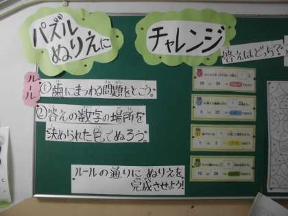 保健室隣の掲示板には,「歯を大切にしよう」という呼びかけの一環として,問題が掲示されています。パズルもあわせて,歯の健康に興味をもってほしいと願っています。
