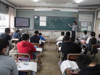 6年2組は,算数科で,合同な四角形のかき方をもとに,「拡大図」のかき方について学習しました。対応する直線の長さや角の大きさに気を付けながら,定規やコンパス,分度器を使ってかきました。