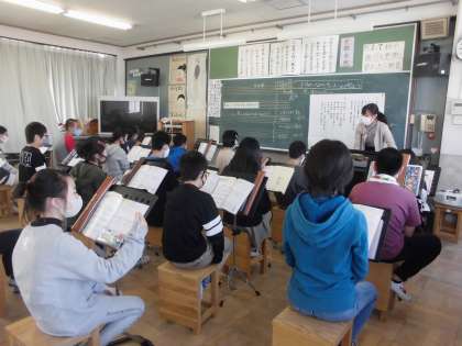 6年2組は,音楽科で,「思い出のメロディー」という曲を学習しました。曲想を味わいながら思いを込めて歌いました。感じたことや気付いたことを発表し合い,イメージを膨らませて歌いました。