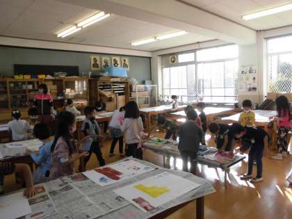 1年1組は,図画工作科で,ぺったん版画に取り組みました。ローラーや野菜スタンプを使って,作品に表していきました。ローラーやスタンプの使い方を工夫し,いろいろな色を使って表現しました。