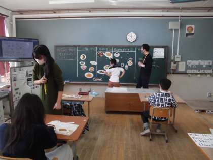 3組は,英語活動で,作った「お昼ご飯のメニュー」を紹介し合いました。主食,副食の写真を机上に並べ,英語を使って表現していきました。思い思いのメニューを英語で表すことの面白さに気付きました。