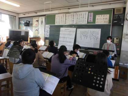 6年1組は,音楽科で,「思い出のメロディー」という曲を学習しました。曲想を生かしながら歌いました。曲の盛り上がりや流れを感じ取りながら,みんなで合唱しました。