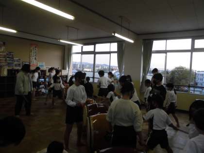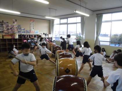 和太鼓部では,ならし打ちや地打ちなどの基礎練習に続いて,「かがり火太鼓」の練習に取り組みました。今日も,パートに分かれて稽古しました。締め太鼓に合わせて,高学年が口伴奏でリズムを整えました。演奏後は,高学年が実際の動きを示しながら,優しくアドバイスしました。