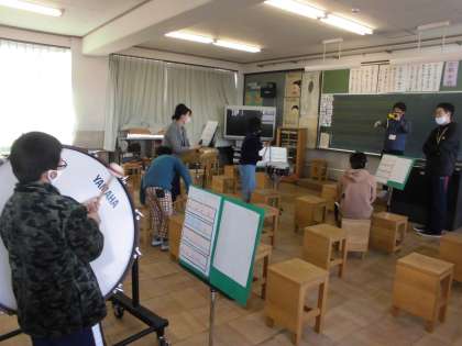 学習発表交流に向けて,合奏に取り組みました。リズム打ちの楽しさが伝わるように,大太鼓,小太鼓,シンバルなどの打楽器を中心に演奏しました。友だちと呼吸を合わせながら,最後まで演奏しました。