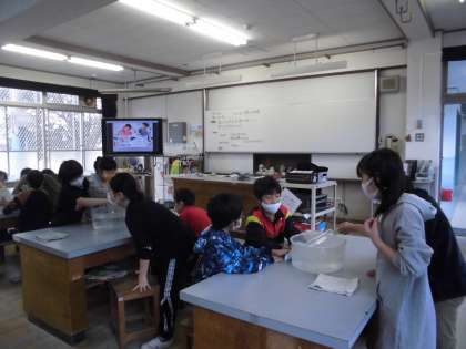 4年1組は,理科で,「ものの温度と体積」について学習しました。空のペットボトルをお湯や氷水に入れてその様子を観察しました。冷やすと表面がくもったり,へこんだりすることを発見しました。