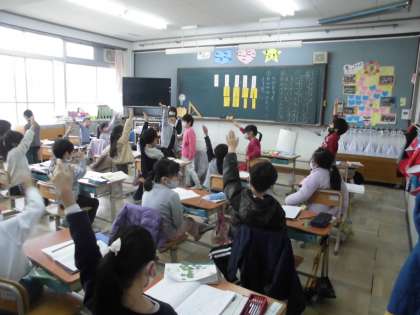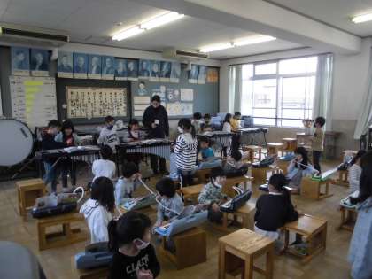 1年2組は,音楽科で,「きらきらぼし」の曲を合奏しました。鍵盤ハーモニカや打楽器等,楽器の担当を決めました。鉄琴のきらきらした音を効果的に入れながら,楽しく演奏しました。
