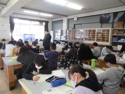 5年生は,両学級とも理科の復習に取り組みました。1学期以来,ものの溶け方等,たくさんの単元を学習しました。実験の結果や考察など,その時々を想起しながら,プリントの問題にチャレンジしました。手引きを見ながら,既習事項を確かめていきました。