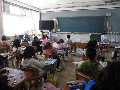 3年2組は,図画工作科で,海の生き物を版に表していきました。魚や貝,カニなどの生き物の特徴を事典で調べ,ケント紙などを使って作品作りに取り組みました。