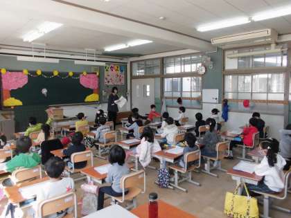 9日(金),1年生は最初の授業で,プリントの配り方やあいさつの大切さなどを学びました。プリントを配る時に,後ろを向いて「はい,どうぞ。」と言いながら渡したり,あいさつの大切さなどをビデオでしっかりと見て学んだりしていました。座る姿勢など,とても良かったです。