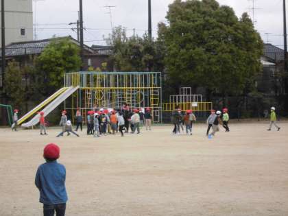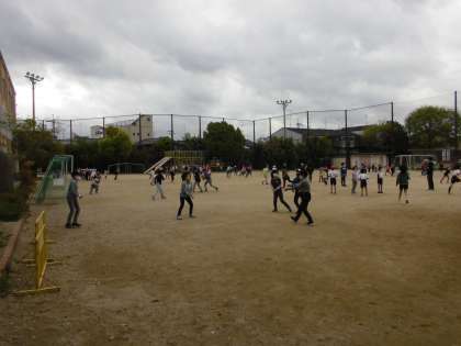 曇り空でしたが,中間休みには,大勢の子どもたちが運動場で身体を動かしていました。今日は,1年生も赤白帽をかぶって鬼ごっこをしました。担任の先生や学級のみんなと駆け回りました。