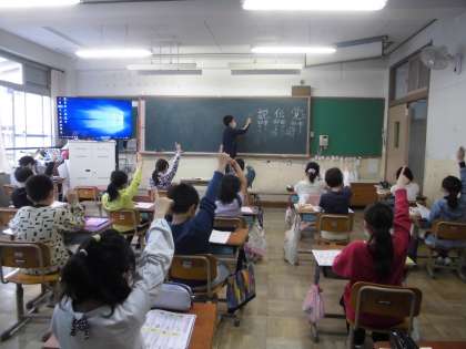4年1組は,国語科の「アップとルーズで伝えよう」というお話の新出漢字を学習しました。覚,伝,説などについて,書き順を丁寧に確かめながら練習しました。使い方も知りました。