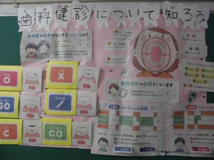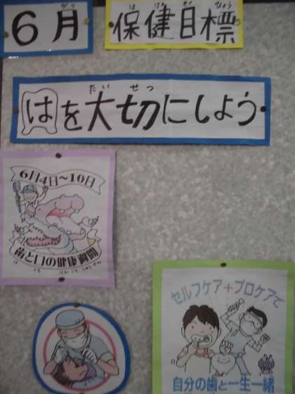 6月の保健目標は,「歯を大切にしよう」です。6月4日〜10日は,「歯と口の衛生週間」といって,歯と口の健康の大切さや歯科疾患予防の呼びかけが行われています。今年のテーマは,「一生を 共に歩む 自分の歯」です。保健室の前や横の掲示板には,クイズも含め,歯磨きの大切さも記されています。