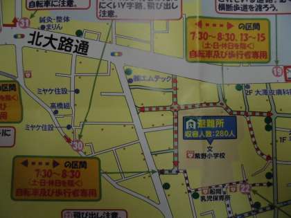保護者の皆様に,登下校についてのお知らせとお願いを致します。先日,『令和3年 こども達の安心・安全 紫野小学校区マップ』を配付させて頂きました。そこにも記載されているように,紫野小学校の周りの道路は,【7:30〜8:30,13〜15(土・日・休日を除く)自転車及び歩行者専用】(許可車は除く)となっています。