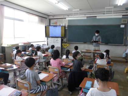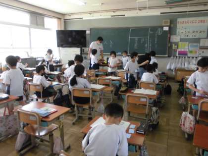 2年生は,両学級とも生活科で,観察カードをかきました。観察カードに,どんなことを書けばよいのかを確かめました。日付,天気,大きさ,手触りなど,育てている野菜を観察しながら書きました。絵も添えて,よくわかるようにしました。